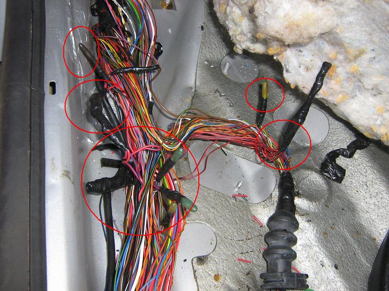 9. След като вече всичко по пода е открито, следва поправката на изгнилите проблемни връзки по кабелите. За целта е необходимо да се развърже снопа кабели за да ги видим. Връзките представляват малки снопчета кабели свързани в едно посредством метални "клипси" и изолирани с гумени маншончета. Тъй като аз реших да поправя всяка една връзка не зависимо дали е тръгнала да гние, развързах целите снопове кабели за да ги търся. тук ще ви покажа местата където има такива връзки.