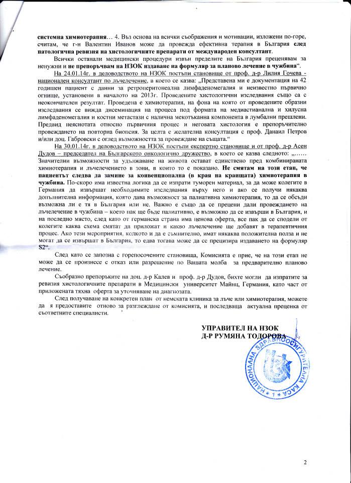 Ето ни отново.Срещата мина чудесно,обсъдихме ситуацията,оставихме материалите от двете операции за нови хистохимични изследвания.Вальо даде и много кръв за различни изследвания.Ще бъдат направени и тестове за каква химиотерапия ще бъде най-податлив и какво лечение ще бъде най-подходящо.Това в България не беше възможно да се случи.Резултатите ще бъдат готови началото на другата седмица и във вторник 14 часа сме отново при доктора.В зависимост от резултатите ще мислят и казват какво ще правим след това.Най-вероятно ще има нов PET-скенер,които да даде актуална информация за положението в момента.Направиха и бързи кръвни изследвания днес,резултатите са задоволителни предвид скорошната химиотерапия.Поставихме началото,сега изчакваме резултатите и действия....