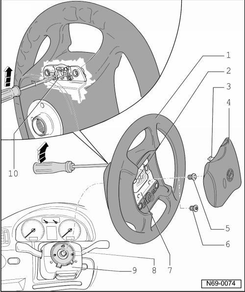 – Press screwdriver in direction of arrow. When doing this the clip - → Item- is pressed back and the locking lug - → Item- of the airbag unit is released.