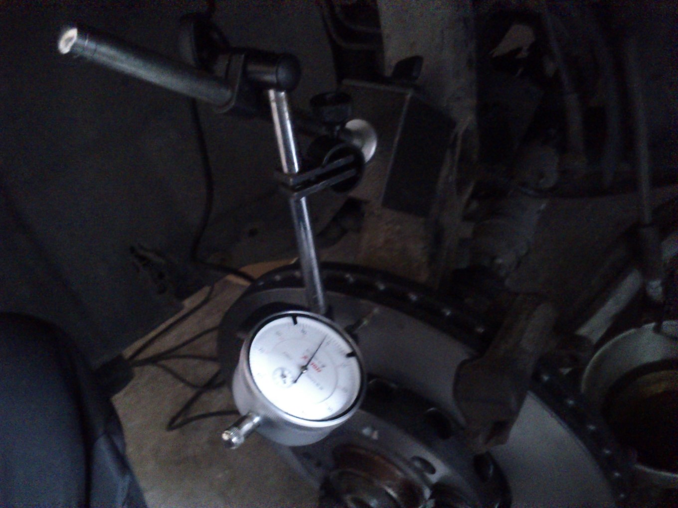 И аз да не остана по-назад спазих инструкциите които има в комплекта с дисковете. Завих с болтове досковете и сложих индикаторен часовник за да проверя дали има биене в главината и монтирания диск. Допустимото биене го дават 0,1мм и ако има по-голямо казват да завъртим диска. Не забравяйте да изчистите главината хубаво с телената четка преди монтажа на диска !