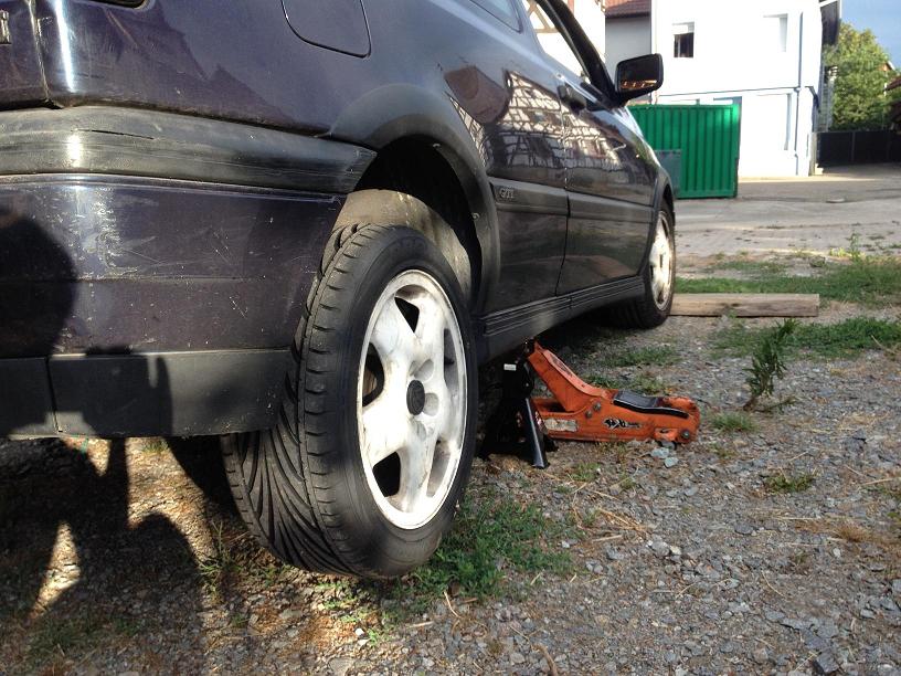 След като прецаках главите на болтовете на кантара, реших да не го свалям. Извадих болта на обратно. Развих го колкото да започне да мърда и да си набележа място за рязането му. Ако имате флекс, набавете си голям диск, защото място за малък флекс с малък диск няма... Отрязах болта на ръка с ножовка. Понеже при опита да извадя болта на обратно опираше в прага, развих лапата за да дръпна целия мост надолу и да го изкарам. Съответно си бях приготвил нов хубав болт с гайка и шайби. Избиването е по същия начин като от другата страна, набиването е малко по гадно заради малкото място което има. След като набих и втория тампон, сложих новия болт и гайката колкото да седи. Свалих колата на гумите и тогава притегнах. Следвах съветите на колегите за стягането. Не виждам много логика в стягането на пусната кола, защото така или иначе болта минава през тампона, а тампона се движи около болта
