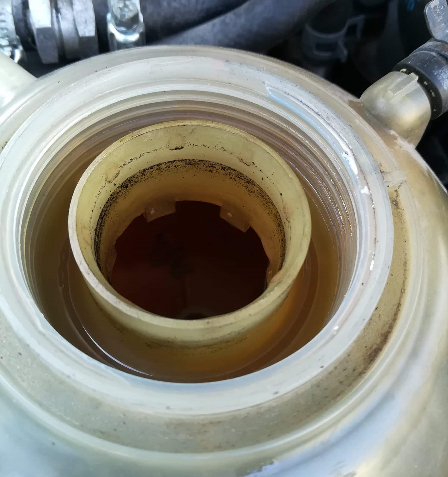 , казанчето на охладителната течност беше потъмняло като компот от сини сливи. Нивото на течността беше около 1 см под минимума, а по стените му имаше черни налепи. Въпреки всичко течността беше бистра, тук-там с леки черни оттенъци. Лятото татко се оплакваше, че понякога губи по малко антифриз, но предположихме, че е някакъв минимален теч, въпреки, че я гледах и нищо не открих