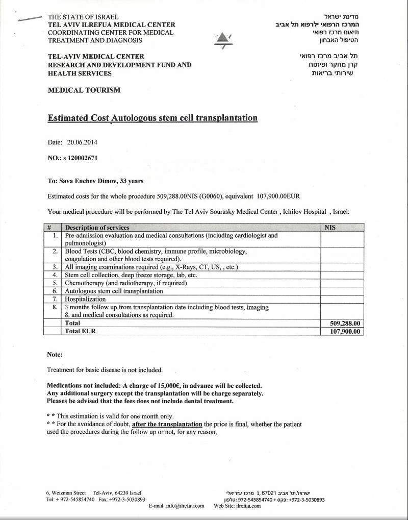 Потърсих варианти за лечение в чужбина и се оказа , че има такова. От болница в Израел твърдят, че могат да ме излекуват чрез така наречената high dose therapy. Това представлява лечение чрез стволови клетки. Същото лечение го практикуват и в Германия и Франция , но за сега имам оферта само от болницата в Израел, която е на стойност 108 000 евро.