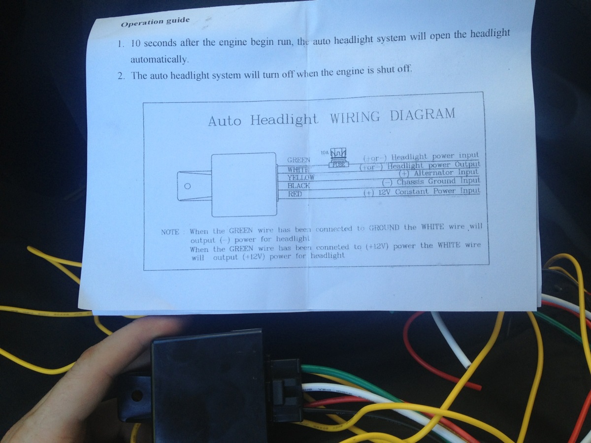 Копчето просто прекъсва жълтия (управляващ) кабел и си го слагаш на място, което ти е удобно за поставяне на копчето (може в ляво от ключа на фаровете). Така, при изключено копче, ще си пускаш фаровете от фабричния ключ с позициите, а при включено копче - след 10 секунди след контакт.