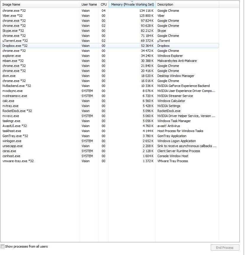 И излизат нови версии драйвери през няколко седмици, особенно за видеото. Ако искаш да си направиш нещата идеални си трябва финно пипане. Аз лично си инсталирам нов Уиндоус като си сменям компютъра или ако излезне нещо фрапантно по - добро, което първо се разцъква на виртуална машина (като излезна седмицата примерно, а сега по някакъв начин успях да свикна и с 8.1 и го сложих за основен). През останалото време просто поддръжка и всичко е наред. Но стика толкова Offtopic. Колегата ако каже кой е процеса ще е безценен. А ако нямате доверие на таск маниджър - а, има 1 тулче System Explorer, а предполагам и други подобни, които вършат също отлична работа.