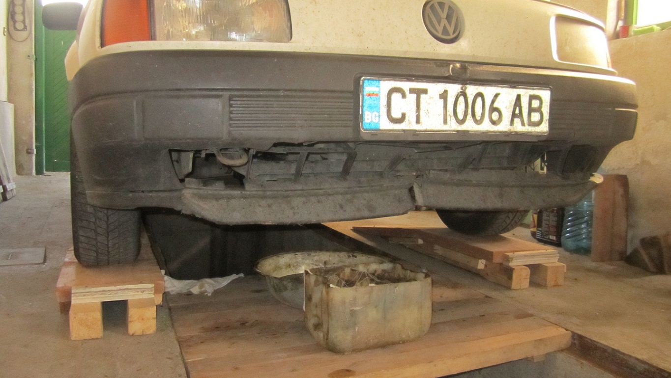 Понеже пробката на картера е малко по-високо вдигната, и винаги остава някакво масло което не може да се източи и тва винаги ме е дразнело, реших да повдигна колата с 15 см в предната част. Сега се източва всичкото :mrgreen
