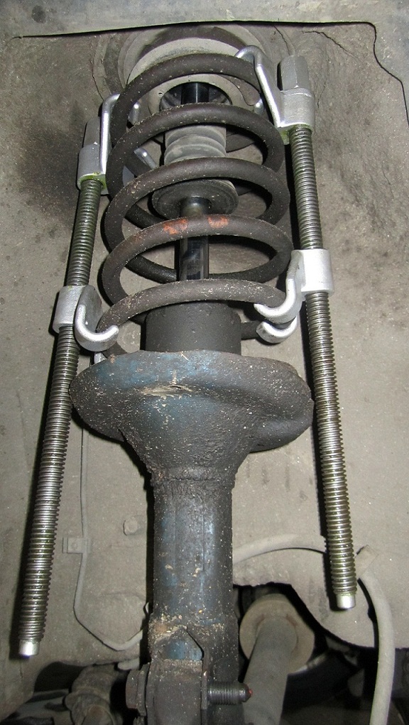 после аз така правя: за да не свивам пружината със скобите както е на място, щото вътре е малко неудобно, със хидравличен крик повдигам отдолу. Така пружината се свива доста, после само закачам скобите и целия макферсон излиза: