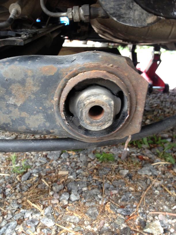 След като прецаках главите на болтовете на кантара, реших да не го свалям. Извадих болта на обратно. Развих го колкото да започне да мърда и да си набележа място за рязането му. Ако имате флекс, набавете си голям диск, защото място за малък флекс с малък диск няма... Отрязах болта на ръка с ножовка. Понеже при опита да извадя болта на обратно опираше в прага, развих лапата за да дръпна целия мост надолу и да го изкарам. Съответно си бях приготвил нов хубав болт с гайка и шайби. Избиването е по същия начин като от другата страна, набиването е малко по гадно заради малкото място което има. След като набих и втория тампон, сложих новия болт и гайката колкото да седи. Свалих колата на гумите и тогава притегнах. Следвах съветите на колегите за стягането. Не виждам много логика в стягането на пусната кола, защото така или иначе болта минава през тампона, а тампона се движи около болта