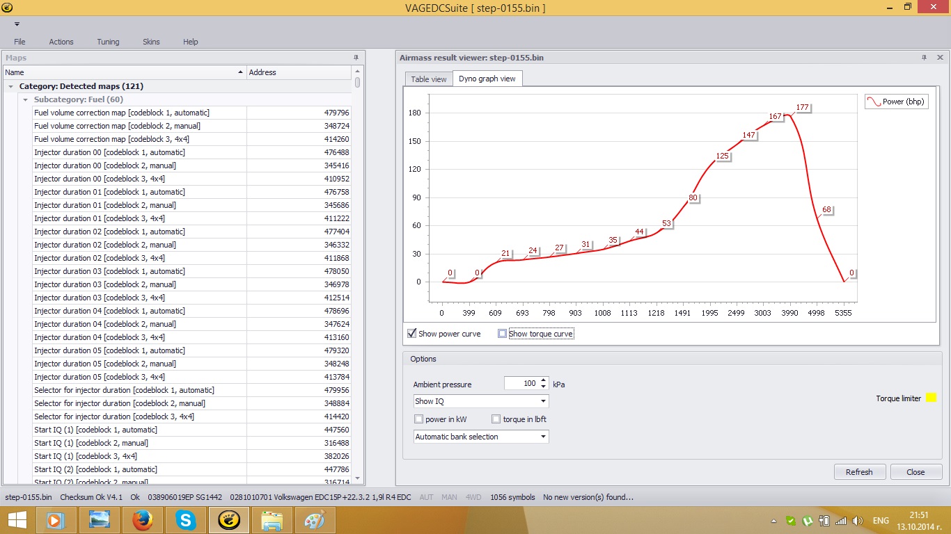 Аз я изтеглих и по нейни данни излиза че и двата файла и моя оригиналния и тоя дето го изтеглих там на дино графиката и двата изкарват 131 коня и на едни и същи обороти. Обаче имам файл който според тази програма изважда около 177 коня и на графиката на мен ми се струва че не е зле самата настройка в смисъл такъв пак като оригиналния плавно кача донякъде конете после изведнъж раздува до някъде и после за 1 път пада цялата мощност. Прикачам 2 снимки на оригиналния файл и на тоя моднатия да погледнеш и ти ако си запознат ако може да споделиш мнение. А от тази програма от verify Checksum ли се проверяват сумите защото ми излиза в нея функция че са наред