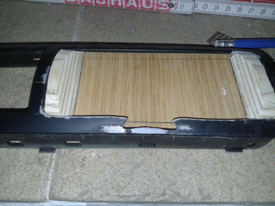 Малко дърводелска работа.... Оформих детайла по начина по който исках да изглежда отпред. После малко кит, за да оправя грубостите. За закрепване реших да използвам алуминиева ламарина по три причини..имах такава, лесно се работи и е добър топлопроводник.