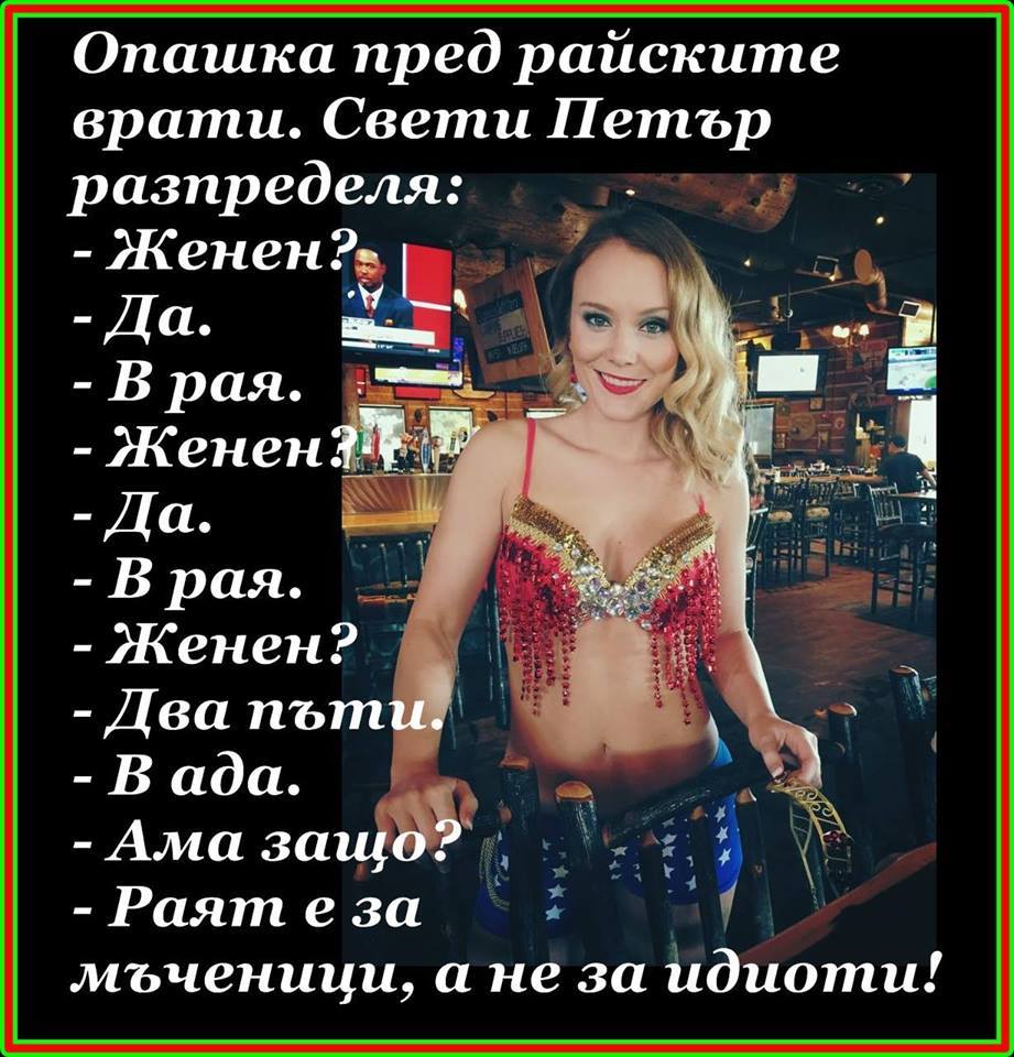Вътре, в салона наредени всичките момичета + мадам. Момченцето влязло, дало двата лева на първата кака и казало