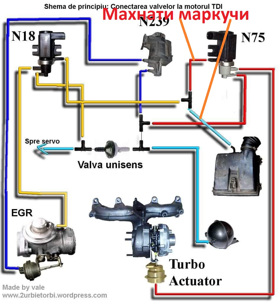 Колеги, пиша и аз в тази тема... бях на почистване на турбото, колата е 1,9тди AHF 110 коня. Майстора ми откачи маркуча, който се вижда на снимката по-долу, каза че така било по-добре...на схемата по-долу съм отбелязал с оранжеви черти кои са махнатите маркучи. Доколкото виждам служат на клапаните да взимат/изпускат въздух може би? Някой знае ли какви могат да бъдат последствията от това? Нямам проблеми с колата върви си доста добре.