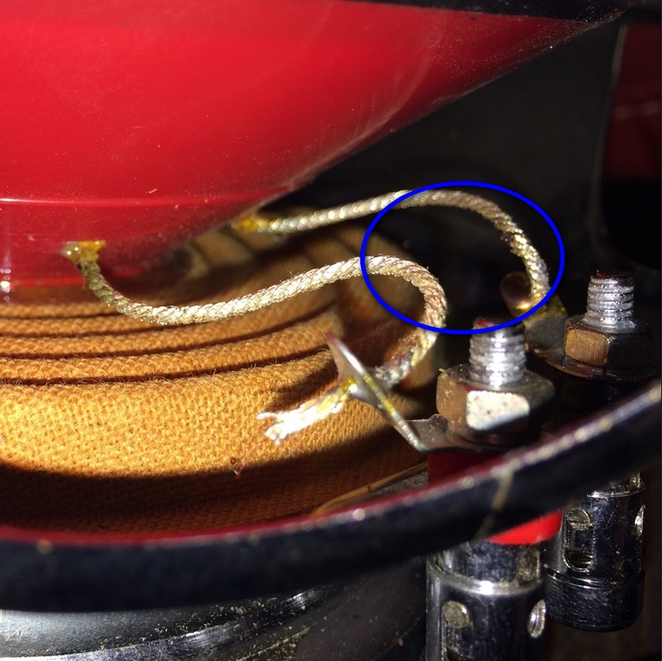 Ако опират двата "мустака" по време на движение на мембраната от оградения в синьо участък на снимката ще спира да свири говорителя в този момент и усилвателя ако има защита от късо ще сработва: