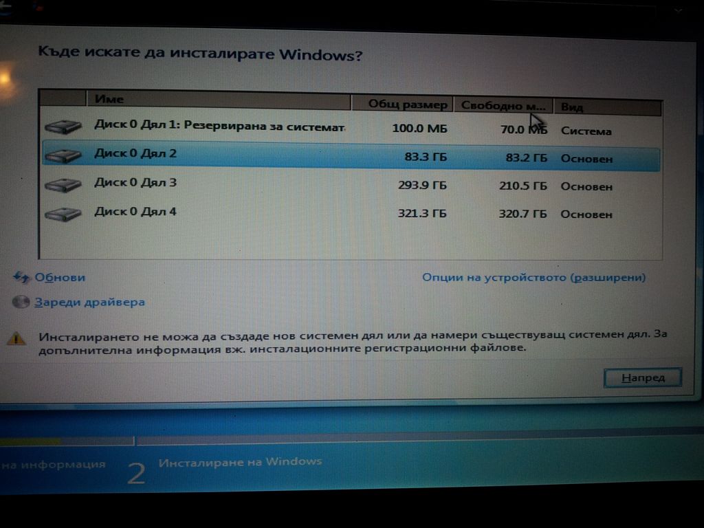 Пробвай да направиш един дял от 100МБ както беше преди, и след това останалото място му дай да направи още един дял. 100 Мб-овия го маркирай като системен, и след това му дай да инсталира на този, който си направил след 100МБ-овия