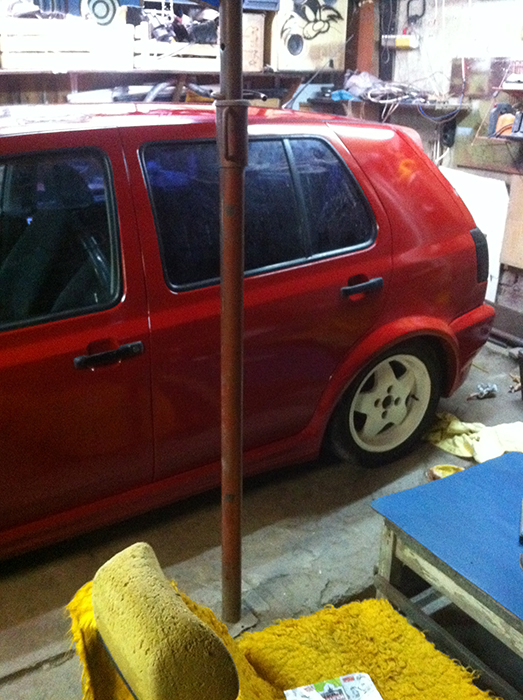 Нямам снимки след първото пребоядисване,но то издържа около месец и пак я вкарах в гаража за пребоядисване,но докато си шкурим ,от познати ми попаднаха прагове от сеат /незнам какъв/,вежди от голф 2ка,и броня предна от голф 4ка, всичко с малко модифициране успях да го напасна..задната броня я запълних малко