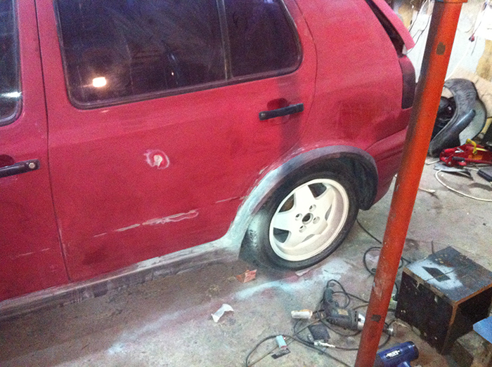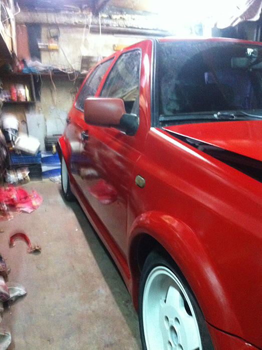 Нямам снимки след първото пребоядисване,но то издържа около месец и пак я вкарах в гаража за пребоядисване,но докато си шкурим ,от познати ми попаднаха прагове от сеат /незнам какъв/,вежди от голф 2ка,и броня предна от голф 4ка, всичко с малко модифициране успях да го напасна..задната броня я запълних малко