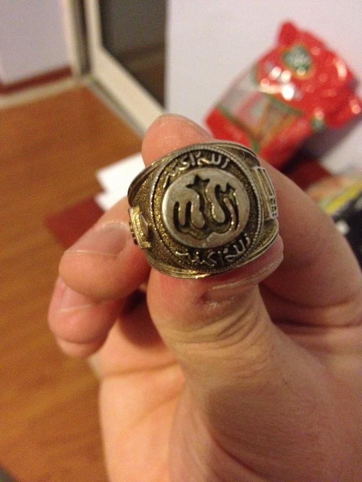 Ислямски пръстен "Алах е велик" отстрани са изобразени "Харам"-а и някаква Джамия (Masjid an Nabawi). Но май няма да е златен тъй като религията им забранявала....
