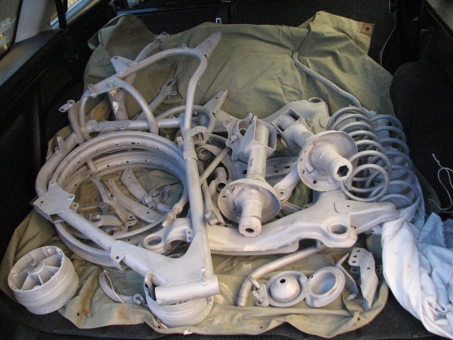 Най-накрая малко топло време и настъпи момента за монтаж на реновираните части от ходовата част отпред.Работите се движат изключително бавно ,работя сам , а и не мога да намирам нови части(макар и ментета). В началото мислех ,че ще има доста неща, а то се оказа точно обратното, но здраве да е , колкото толкова.Това са поцинкованите части: