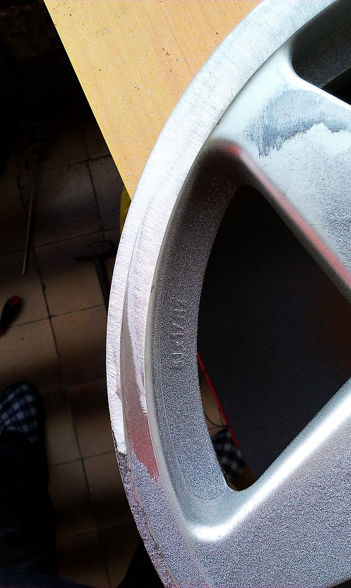 И тъкмо се чудех при кой стругар да ги нося и реших с гумената шайба и шкурка номер 60 да пробвам само какво ще стане.А то взе че се получи идеално.Със шайбата се работи много лесно.След като изравних унищожения ръб,направо се сля със борда и се получи идеално право.Като му хванах цаката и докато се усетя,две от джантите бяха готови,утре може да тръкна и другите.