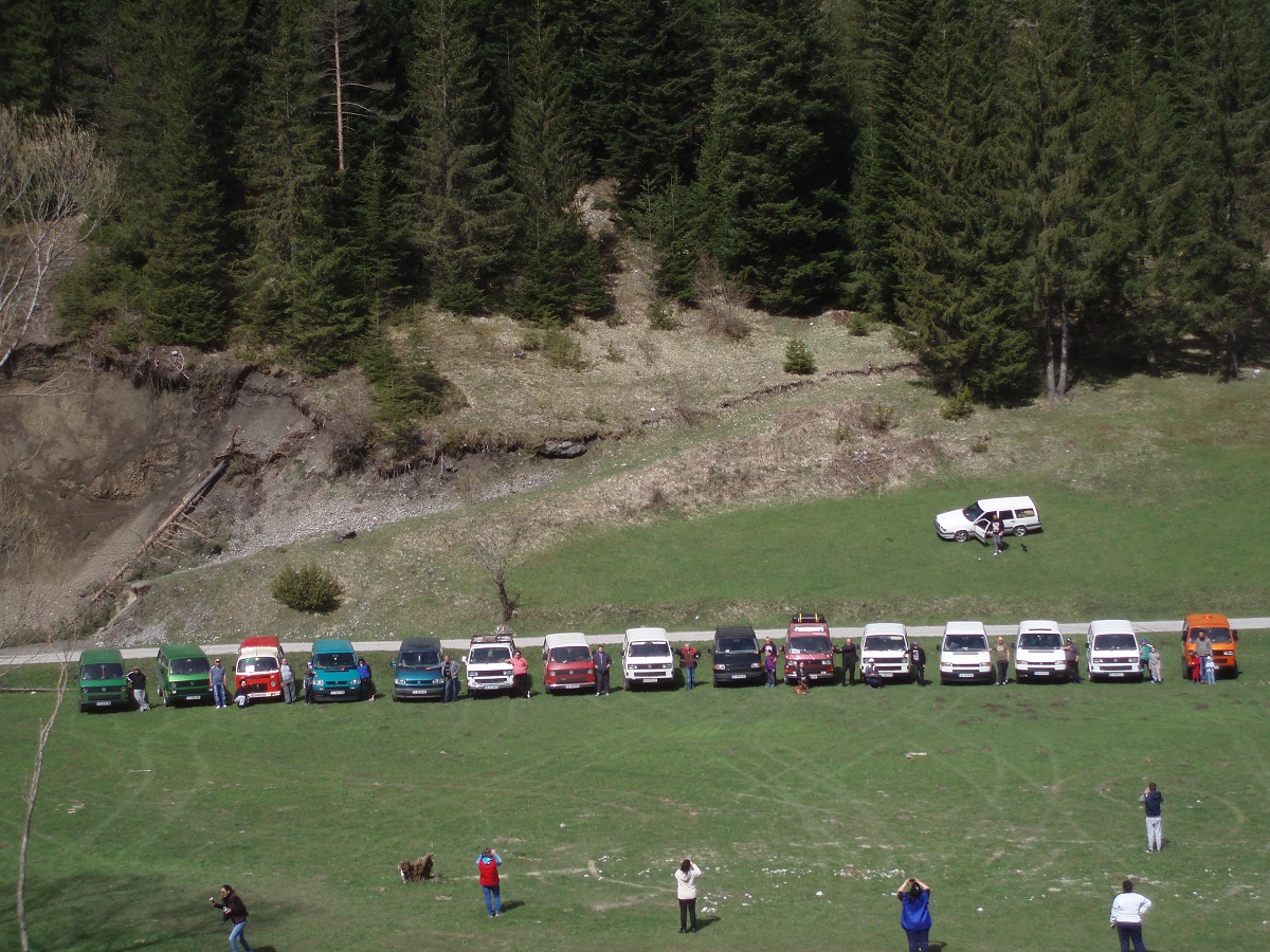 И така, най накрая стигнахме до сервиза на Ицо,от където се даде началото на разходката.Придвижването до Асеновград се оказа малко бавно и затова закъсняхме.На място решихме ,че най-добре е да намерим една поляна на около 30-40км от Асеновград за първата вечер. Ицо ни каза за една такава над Хвойна. За съжаление буса на Димчо беше аварирал и се наложи да остана с него, докато другите тръгнаха към поляната.След бръз ремонт, потеглихме и двамата....но аварията пак се обади и Димчо се върна за повторно ремонтиране.Пътя към лагера се виеше през гората и природата....Накрая се стига до една голяма поляна и на нея Ивчо беше построил лагера...Бусовете бяха наредени почти в кръг около основните шатри...с изключение на един......но това е друга тема за разговор.На места имаше и все още сняг и не се стърпях, залудях по баирите..и....забодох синхрото в едната преспа......За съжаление доста се изложих......окопах се като пиле в калчища и се наложи Мирко с оранжевото синхро да ми помогне малко.Вечерта мина както обикновено....ракия, салати и две китари.....С бат Заре отново се разпяхме....Шатрите бяха пълни с весели и щастливи бусаджии на които им беше приятно.Ние с Ивчо също бяхме щастливи, тъй като едно на пръв поглед невинно събиране се превърна в един мини бус събор на приятно място.
