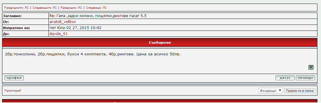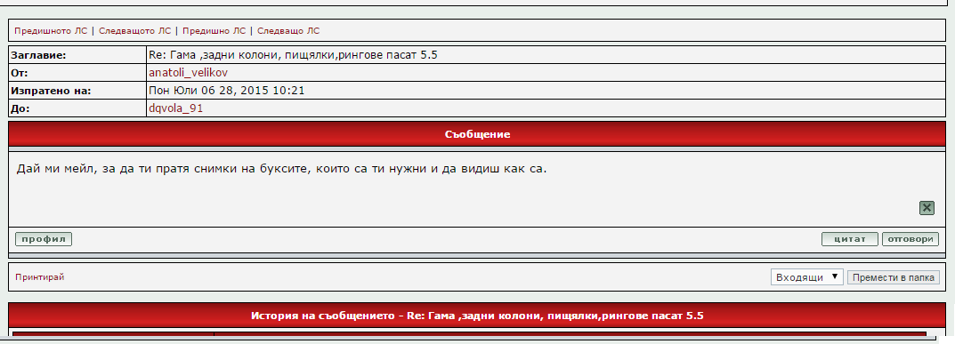 и в крайна сметка от " Колегата " избрах да закупя 2 броя големи колони + букси за тях, 2 броя адаптери (рингове ) за колоните, 2 броя букси с 2 броя дръжки с пищялки и той ми отреди цена 45лв, накрая отново си промених мнението и му поисках с 2 адаптера(рингове) и 2 комплекта инсталация повече и една колона(но нямаше налични колони и не съм взел) и поиска 5лв за тях и общата сума стана 50лв. по телефона му бях обяснил,че търся за задни врати и буксите с кабелче,за да ги направя грамотно и утре като ми се наложи да мога да ги сваля от буксите,че да не режа и т.н. И така дойде време да се видим обадих му се,уговорихме се срещнахме се и от тук дойде и разминаване в нашата хронология. Всичко беше както говорихме и любезно ми прати снимки на колони,рингове и дръжки(без инсталация-никаква). Получих всичко без 4те комплекта кабели с букси както беше написал сам. Като го попитах с повишен тон отговори" това имам аз така или иначе ще ги прода,ако иска взимай ги" чувствах се подведен още в този момент,защото бих излишно път,за всичко от 1 човек и лично предаване . Поговорихме малко (и аз нямах време,бързах за работа ) и накрая аз взех 2 броя колони,4 ринга 4 букси за големите колони без нито една букса за пищялките(като беше донесъл 1 брой букса,но си я взе в бързината -дори не разбрах кога явно докато сваляше бутона за ел.стъклото) като цената била 50лв за всичко,но ми хвърли двата кабела за големите колони и аз платих 45лв и колегата ми подари 2 броя букси за големите колони,защото не бил за 5лв и се разбрахме на понеделник 06.07.2015 да се видим на същото място и да ми даде останалите 4 букси за пищялките, лично го попитах аз или той ще се обади-отговори ми той ще ми звънне. Нашата случка се развива петък 03.07.15г и дойде понеделника и чакам обаждането,но получавам ето това съобщение : и следователно последва моят отговор на съобщението и получих ответен отговор