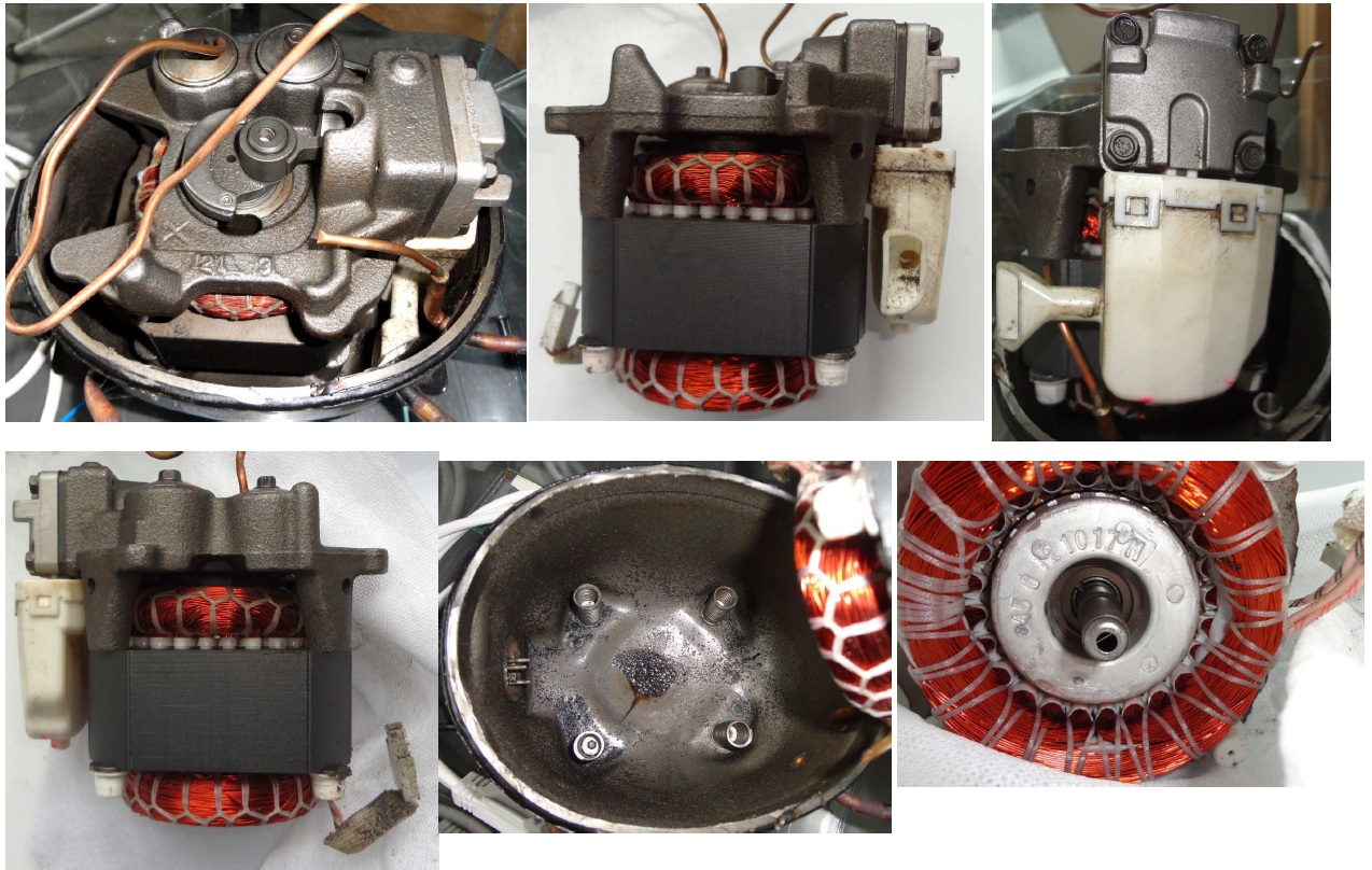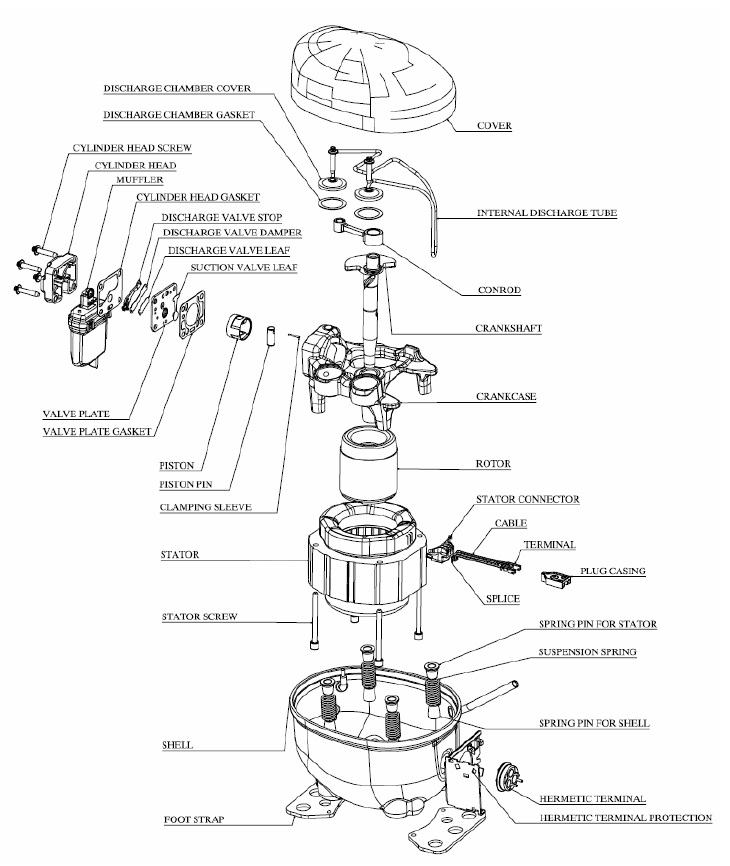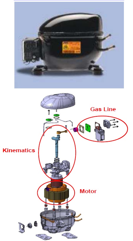От схемите на компресорите се вижда че самите компресори са окачени на четири пружини спрямо корпуса(кожуха) на компресора - възможно е също при неправилен транспорт компресора да се откачи от тези пружини спрямо корпуса и тогава приемливия вариант е смяна на компресора. Преди 15-на години си играехме да ги отваряме и да ги наместваме, но вече е безсмислено упражнение. То най-вече се отваряха поради това ще тънката тръбичка която се вижда на снимките и схемите се откъртваше от мястото и на свръзка с корпуса почваше да байпасира вътре в корпуса. Но пак казвам вече компресорите са лесно достъпна стока.