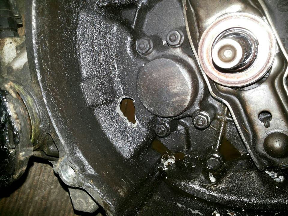 Сменена рейка, защото старата прокапа. След смяната на рейката отидох на реглаж и се оказа, че задният мост е крив. И той беше сменен. Когато вече всичко изглеждаше перфектно по колата, дойде деня в който се счупи скоростната кутия... Последиците бяха: пробит корпус на кутията и омаслен съединител.