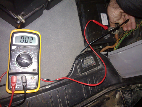 По този начин в момента, в който октачите кабелът от клемата, токът продължава да тече през мултицета и не се прекъсва веригата, следователно няма опасност утечката да изчезне. След като вече токът минава през мултицета, погледнете какво показва дисплея: ако показанието е до 0.04 (или до 0.05 за Phaeton, вж. технически бюлетин на VW по-горе, стр.2) значи няма проблем – това е нормална консумация за автомобил VW, който е в „спящ“ режим. Ако стойностите са по-високи, тогава преминаваме към стъпка Б., описана по-долу. Сега върнете внимателно кабела върху клемата като внимавате да не ви се изплъзне сондата на мултицета (което ще доведе до нежелано прекъсне веригата). След това махнете мултицета и си затегнете минусовия кабел върху клемата на акумулатора.