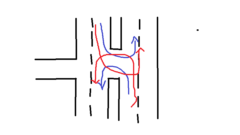 Кое е правилно? Аз смятам и знам, че при правене на ляв завой от 2 автомобила не трябва да има конфликтна точка- следователно- синьото. Но тук пълно идиоти дето твърдят обратното- червените стрелки. Сори за детската рисунка, ама от мене на компа толкова :mhihi