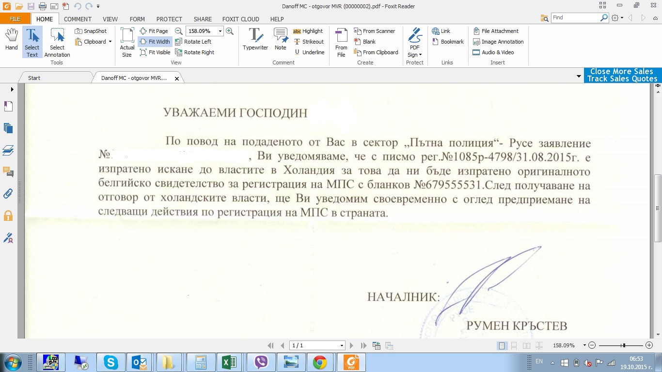 Unfortunately I cannot find a letter in the archives registrated with your reference number 1085p-4798/31.08.2015.