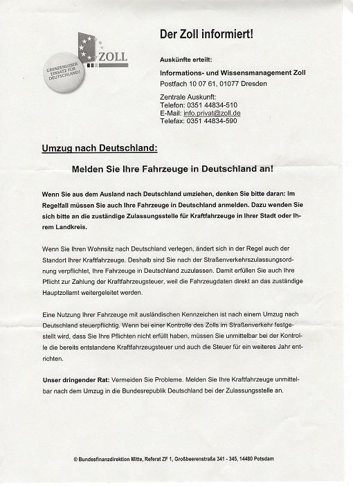 ИмаШЕ вариант. Полицаите вече при проверка не си правят труда да ровят или глобяват, а препращат данните на цоламта. След месец, два, три или повече, когато ти дойде редът пред съответния служител получаваш задушевно писъмце в смисъл ,че се явяваш нарушител по смисъла на § 1 Abs. 1 Nr. 2 Satz 1 KraftStG, § 1 Abs. 1 Nr. 3 KraftStG ииии... черешката на тортата, § 370 AО. Тва последното е отврат. С любезна покана да си изложиш позицията по случая. И не ги брига хич чия е колата, вече десетина такива писма съм чел по силата на обстоятелствата...