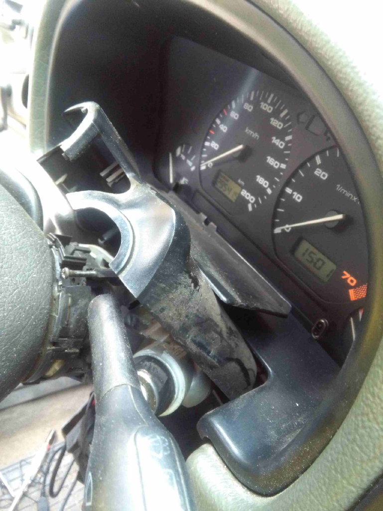 Реших, че съм се разминал само с радио, но после като се загледах видях, че около волана корите са счупени, гривната на фабричния имубилайзер около контактния ключ висеше свободно и куплунгът с кабели към контактния ключ е изваден. След като се загледах още по-подробно установих, че металната гривна около оста на волана (не знам как и е името), към която са закачени ключовете за мигачите и чистачките и вероятно щифта, който блокира волана е счупена на няколко парчета.