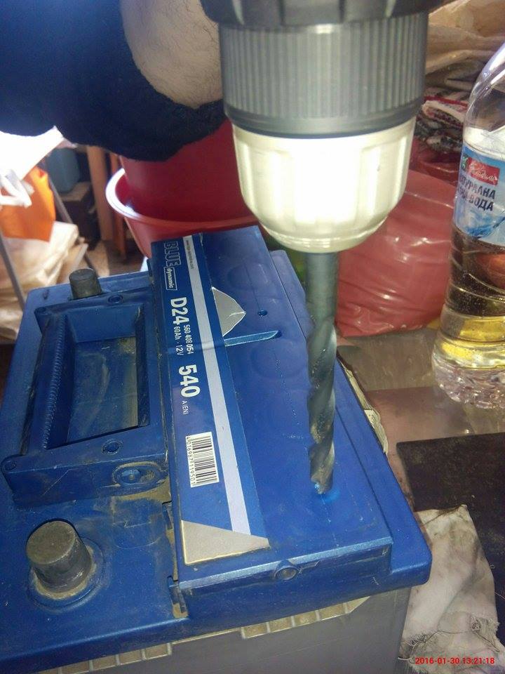 Toва го правя на втори акумулатор.На първия се получи перфектно.Пробива се с бургия 9мм.Нарязва се резба с метчик 10мм.След това се вижда нивото и се мери с денсиметър гъстотата.Има маркер, на който се вижда до къде трябва да е нивото и се допълва до там.След което аз завих по една капачка на всичките 6 клетки. Ако нямате може да се заелее с двукомпонентно лепило. След това е добре да се зареди поне 10часа.