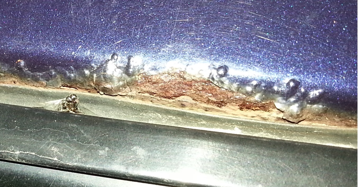 Вземаш една едра шкурка,търкаш хубаво до където можеш да стигнеш.После един спрей на голия метал или това което е останало от него.