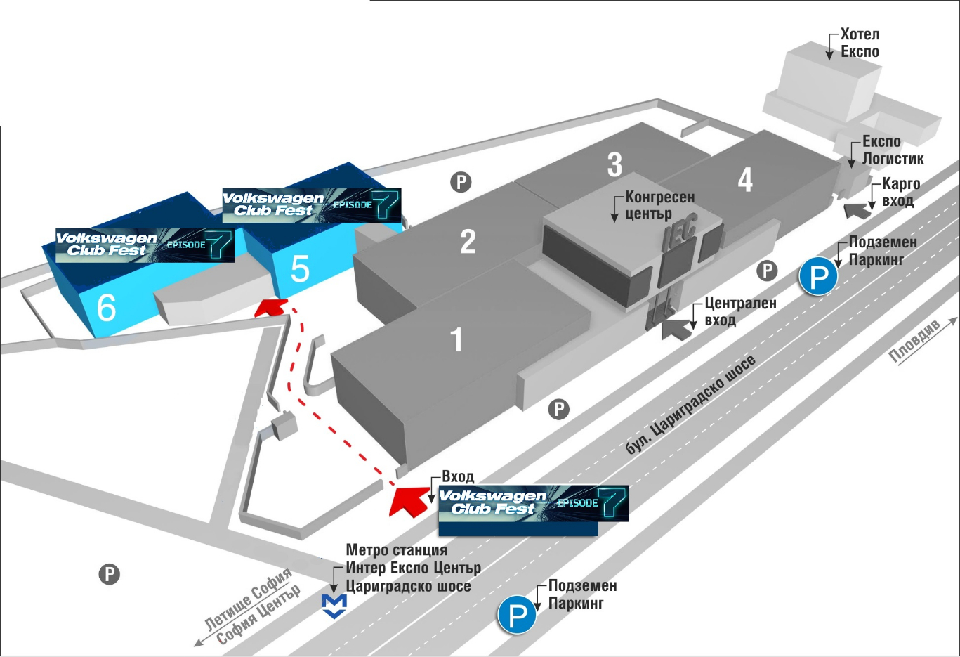 Това е схема, по която можете лесно да се ориентирате при посещениото на събитето. Имайте предвид, че най-големият и удобен паркинг е буферния на метрото. За него може да се влезе както от страната на хипермаркет Метро, така и от страната на Интер Експо Център. Срещу закупено билетче за метро първите два часа са безплатни, а всеки следващ е на стойност 50 стотинки. Билетът за паркинг, който ще изтеглите при влизането на бариерата, след представяне на билета за метрото, се таксува на касите за билети.