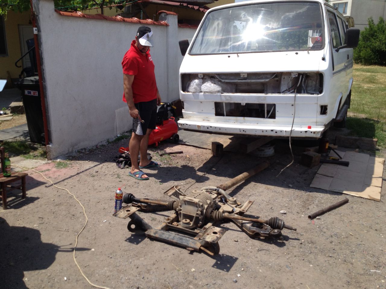Всичко започна още преди 2-3 години когато видях въпросния бус ,а той е бяло Т3 1,9 воден боксер 1985г синхро с блокаж на единия деференциал и правен на кемпер от някой любител.Видях буса изоставен до един блок от доста време ,исках да го взема и да си го реставрирам и съответно да го ползвам като кемпер.Започнах да издирвам собственика за да се разбера с него,но при срщата ни той отказа да го продаде......и така 2 години аз ходя да го питам ,той се дърпа .... накрая му писна и ми го продаде.Взех го веднага последва разглобяване на интериор,екстериор,двигател...оголване на купето за реставрация.Двигателя се оказа ,че е в плачевно състояние ,ризите бяха пълни с вода ,купето ужасяващо зле от към ръжда и изгнило .Започнах да си набавям части с идеята да го кърпя и обновя малко ,като му купих органайзер за таблото,отваряеми предни стъкла,и странични средни,задни с пластмасови перки за въздух,никелирани брони,инсталация с новите бушони,надстройка....и доста др. неща.Извиках майстора който щеше да ми го кърпи ,но като видя за какво иде реч ми каза ,че ще ми излезде златно и по-добре да си купя купе или направо бус.Свърза се с мен колегата musuibie и ми предложи едно купе.Отидох до София да го видя ,беше китка пред моето и се разбрахме за евентуалната сделка /благодаря отново за отделеното време беше приятна среща /,но след ден,два ми се обадиха за едно цяло бусче Т3 Каравеле 1991г 1.6ТД в много добро състояние ,но с блокирал двигател .Реших да го купя и да почна да стягам него като в последствие го направя синхро .Вече е разглобен и в процес на размисъл какъв да бъде двигателя? 1.6 ТД,1.6 ТДИ или 1.9 ТДИ спираме това ,че трябва да минавам КАТ и за това май ще съм със 1.6ТД ще опитам да го направя като Голф 2 ГТД с интеркулер.