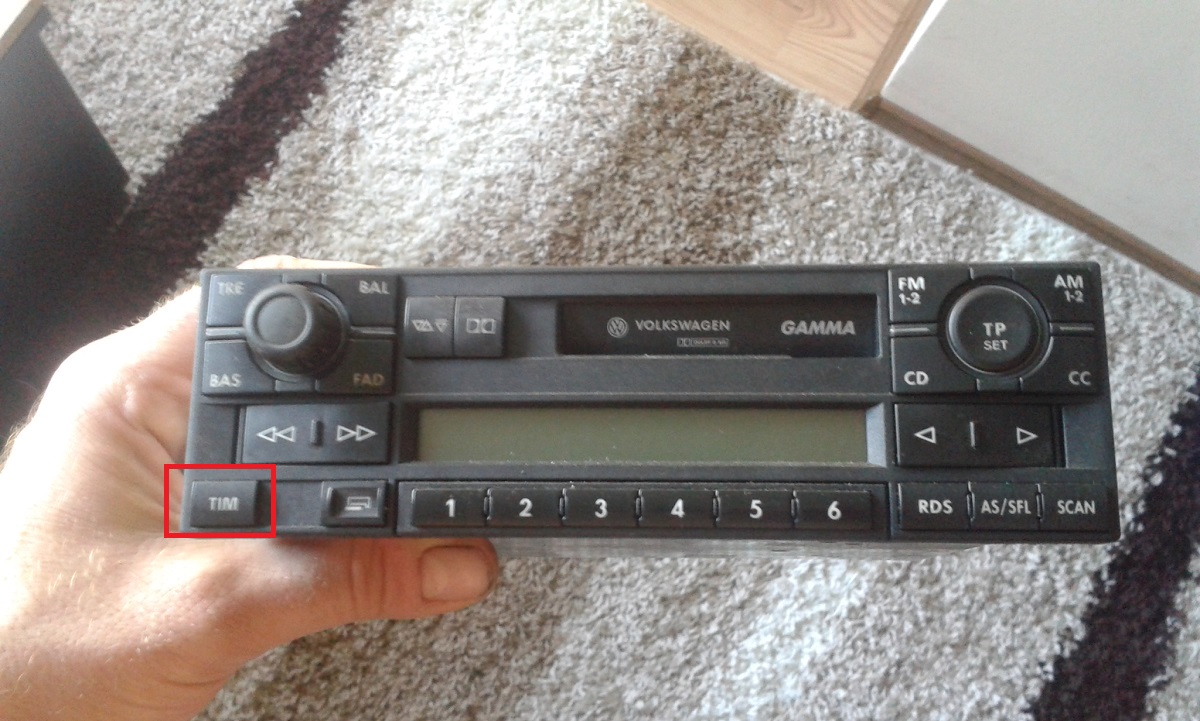 Става въпрос за оригинална Гама 5-та серия, която се монтира в Пасат Б5,5. Докато беше на колата касетофона си работеше, свалих го и го монтирах на моя Пасат Б5 и единственото, което изписа е съобщението "TIM 2h" и премигна червена лампа до бутона "TIM" на самото радио (ограден е долу на снимката).