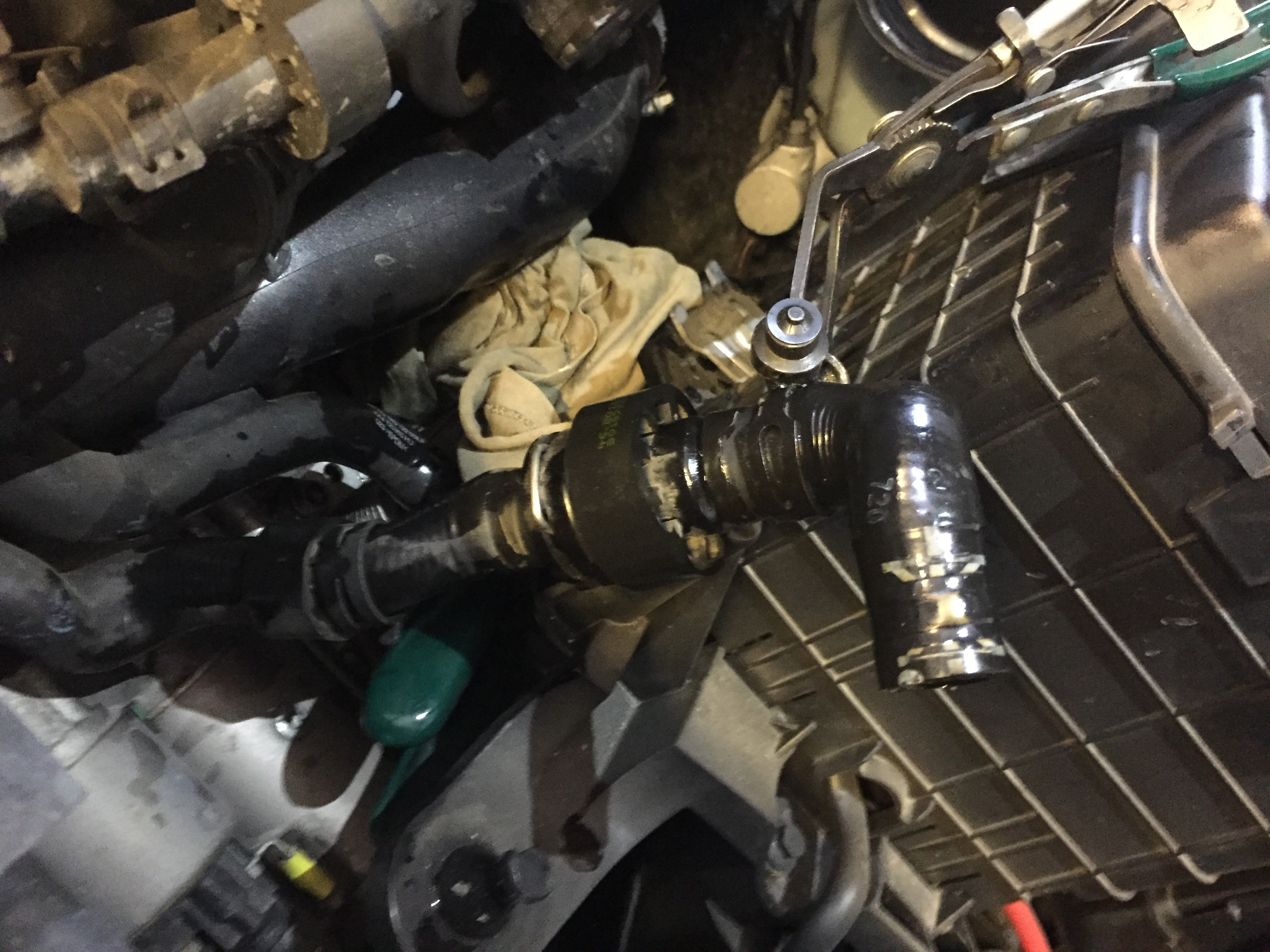 След това кутията се усуква леко със задната част нагоре, за да заобиколим един маркуч на охладителната система, като при издърпването внимаваме за шнорхела, който е отдясно и отива надолу. Ето я извадена: