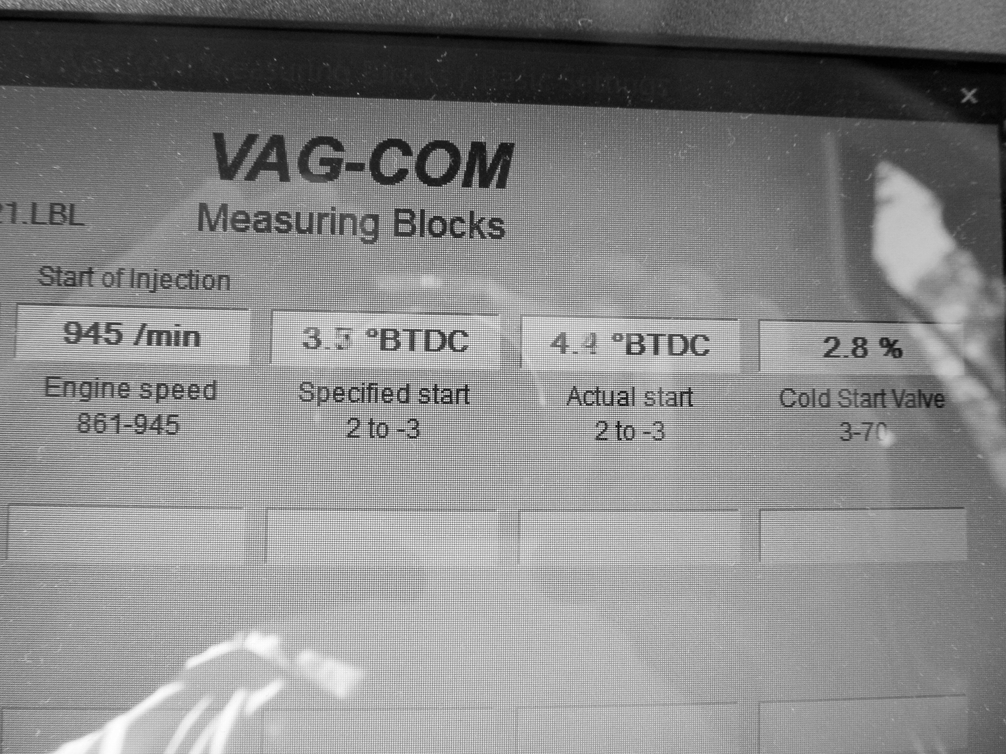 А графиката как е? Тая центровка на слуки ли я правиш или ползваш VAG-COM да виждаш какво се получава? Оборотите на мотора защо са 945? Не е загряла или настъпваш газта? Центровка се прави на загрял мотор и VAG-COM в режим TDI-Graph!
