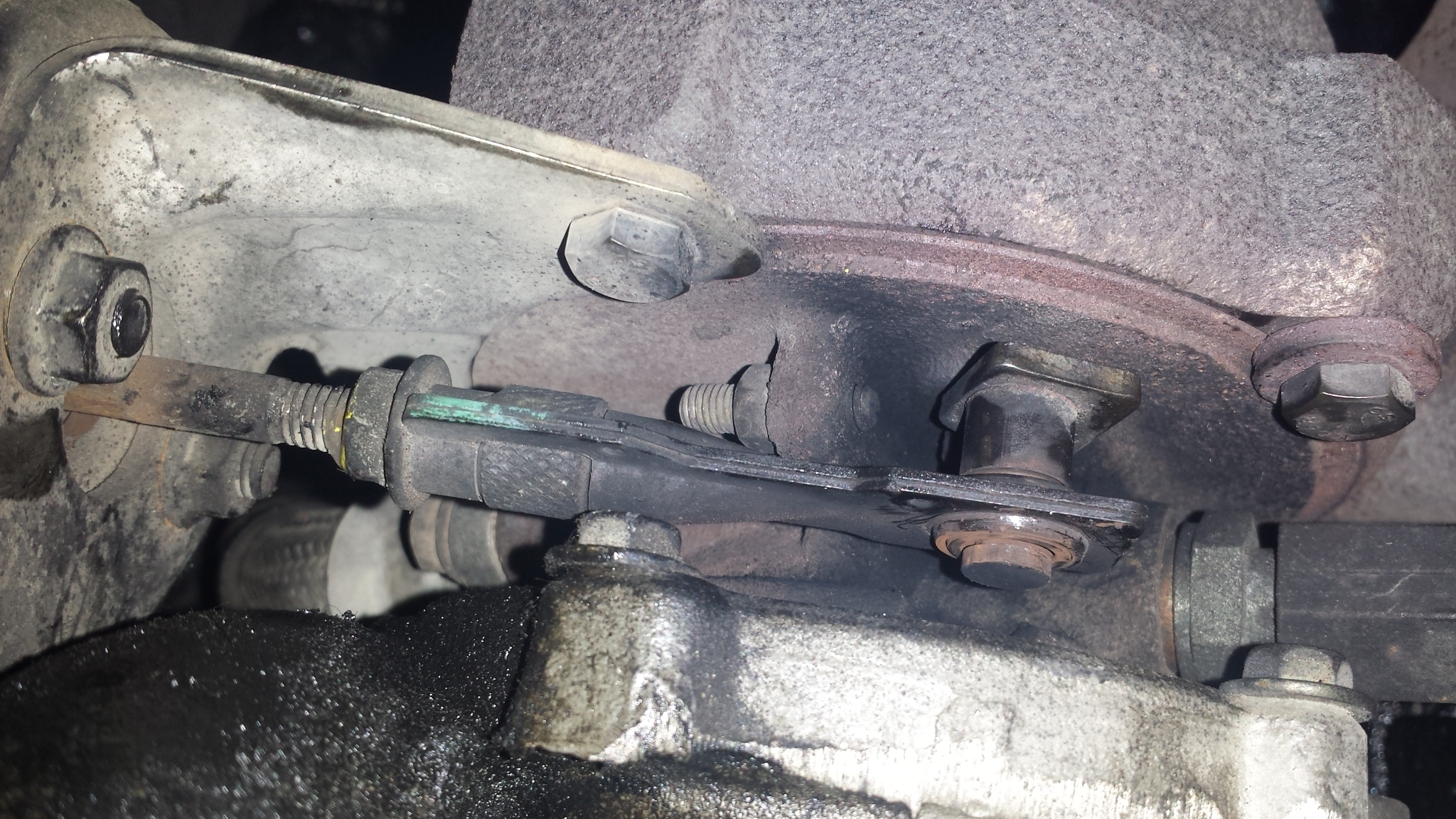 Ако искаш да провериш геометрията трябва да се откачи актуатора от лостчето и долу да се развият двете гайки които го държат, без да му пипаш настройката. Вече тогава може да провериш дали геометрията отива догоре(при пълно разтоварена турбина) и дали опира долу в стопорния болт. Ето на снимката се вижда колко долу горе е хода, така турбината е в крайно положение, вижда се колко е хода да опре долу в стопорния болт. Като е закачен актуатора се движи трудно защото пружината му е яка а и като са закачени вакумите е почти невъзможно да го мръднеш. Като откачих актуатора геометрията толкова лесно се движи че като бутна лостчето горе и го пусна само опира в стопера. Долу горе да имаш ориентир как трябва да се движи.