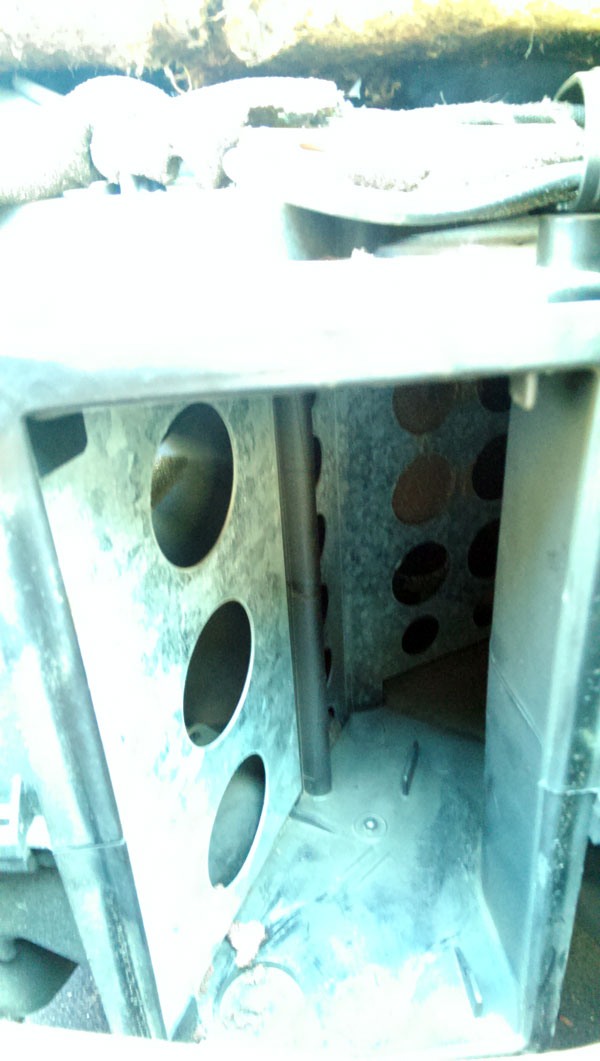 Радиаторчето няма как да ти се задръсти от външната страна с боклуци, до степен да не духа топло. Разви ли болтовете на тая планка, която е при скоростния лост. Трябва да я изкривиш към стелките, за да може да падне гредата. Имаш 2 болта долу на тунела, развий ги и махни планката.