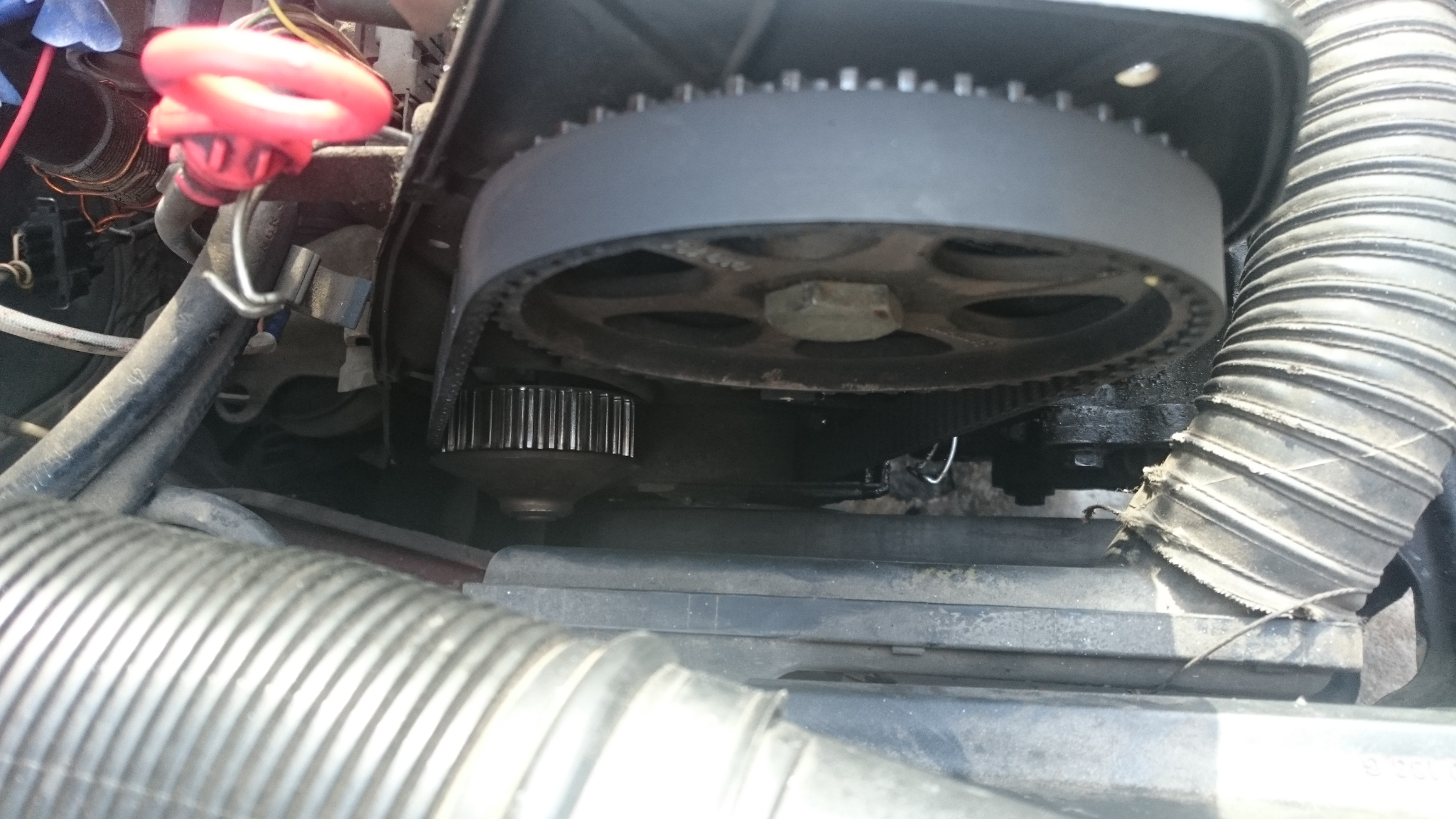 Ремъкът на алтернатора защо го намесвате, като ясно се вижда, че водната помпа се е размърдала. Не съветвам колегата да си прави експерименти, а по-скоро да посети сервиз и да се разбере причината за това. Понеже ангренажът се обтяга само от водната помпа. Ако стане така, че се случи нещо с обтягането е възможно моторът да стане на салата