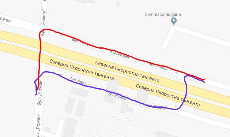 Преди да асфалтират подхода от бул.Рожен надясно към тангентата да тръгнеш към Пловдив ,и аз съм минавал в насрещното,сега обаче като се спуснеш по отбивката за Требич не тръгваш веднага под моста все едно искаш да се връщаш обратно както се правеше преди,ами подминаваш първото ляво и стигаш до самия бул.Рожен и там се включваш в него с ляв завой който при натоварен трафик е малко труден,не съм забелязал да има знак "забранено на ляво" ! Мисля че друг вариант за слизане от тангентата към Рожен не е предвиден ! Забраненото беше със синьото на снимката,а сега минавам по червеното !
