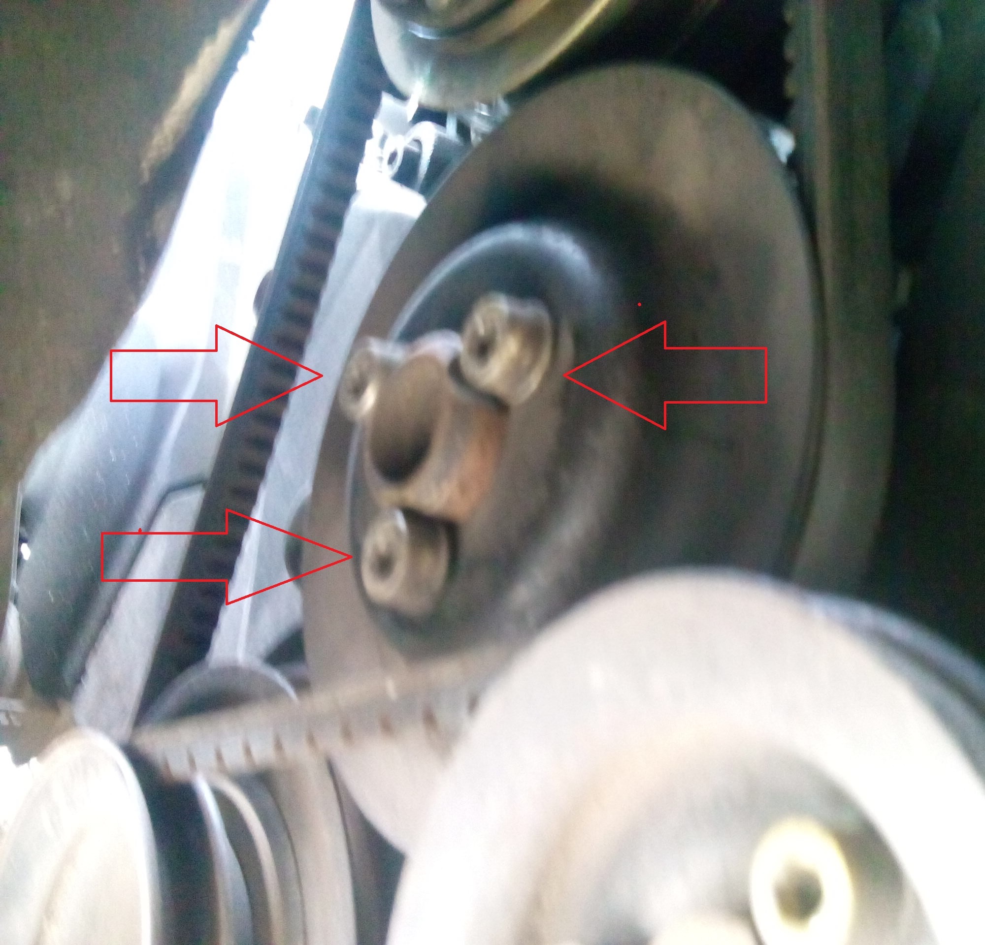 Отгоре виждаме шайбата на водната помпа,охлабваме болтовете и докато още са сложени ремъците.
