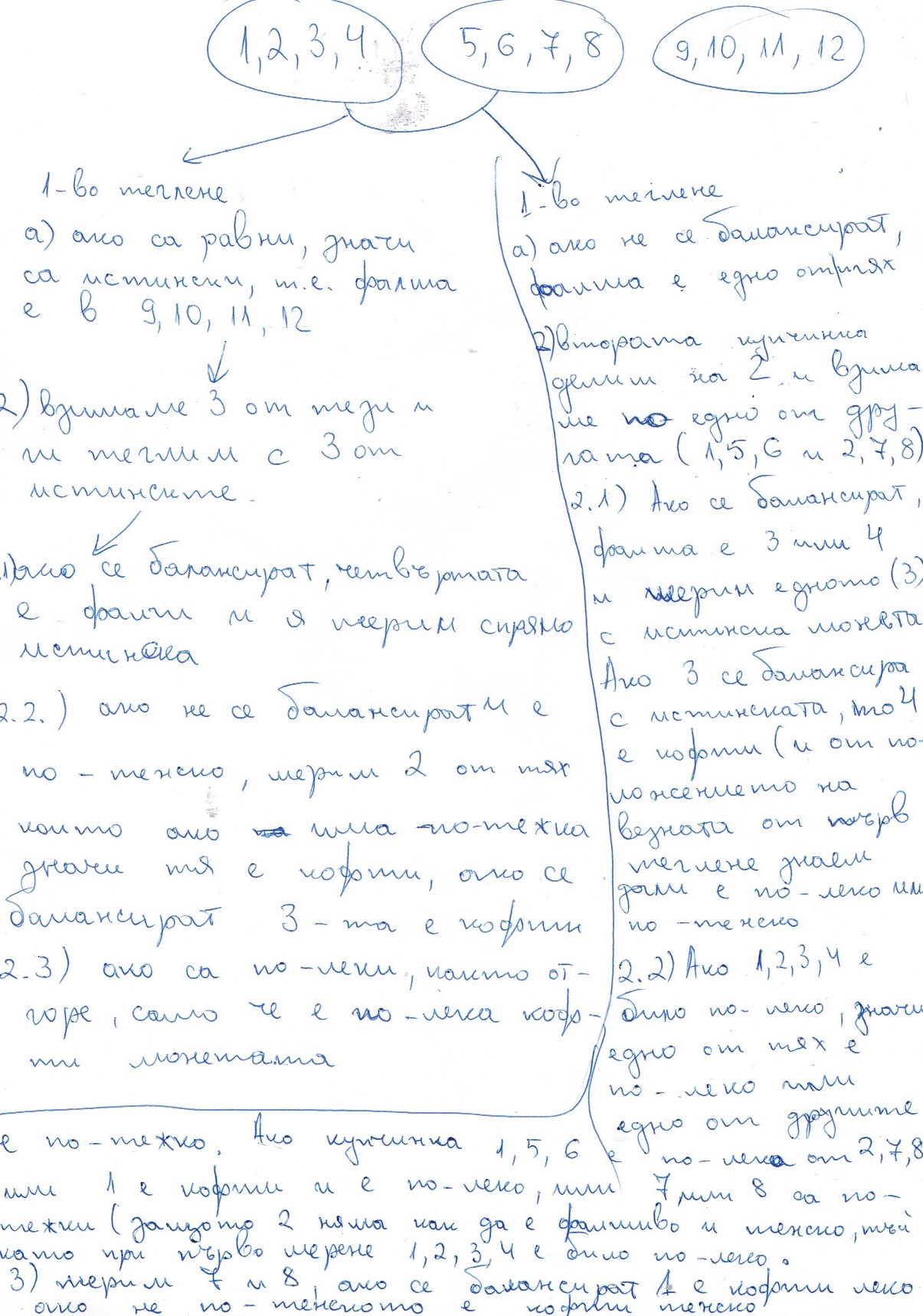 Накрая ако имаш 3 монети на везната няма как да знаеш коя е по тежката. Може да е от по леката страна,но действително да е по тежката!