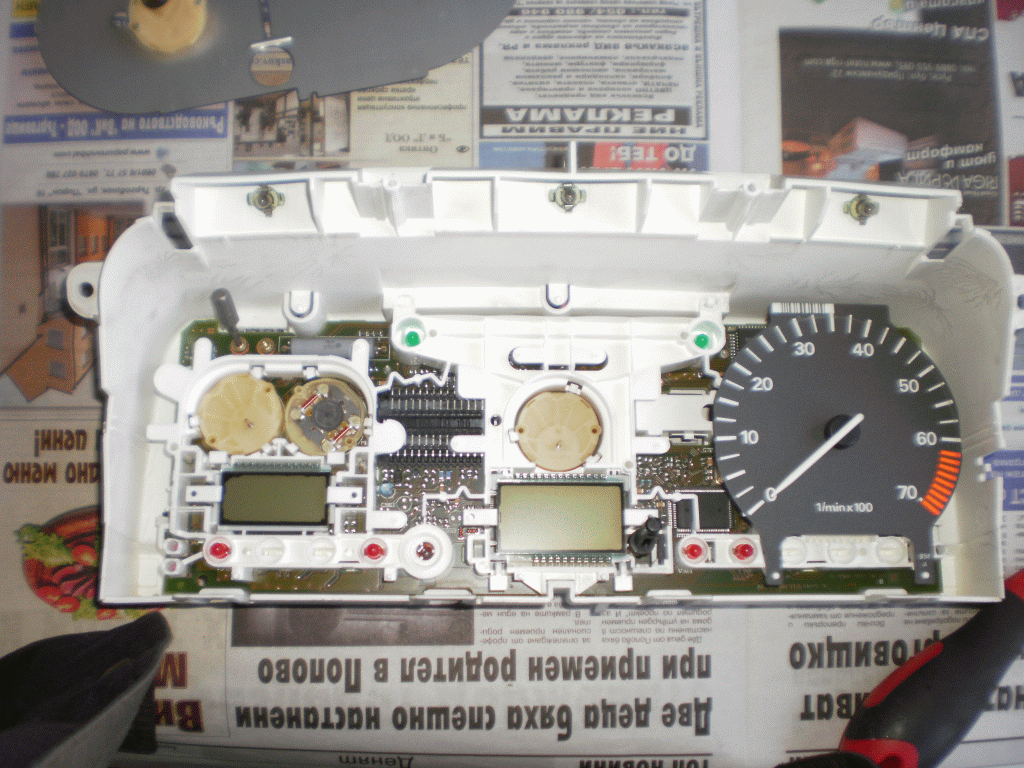 Ако си извадил инструменталното табло, махаш прозрачната пластмаса, после се маха стрелката на оборотомера.