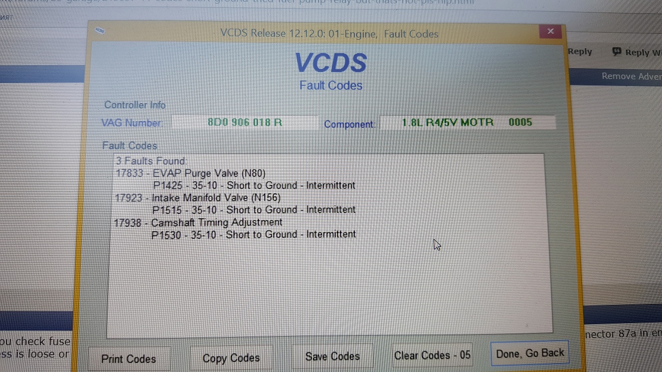 карам пасат 2000г. 1.8 бензин 125 коня с ГО. Преди известно време колата започна да ми прави номера с паленето. При загрял двигател, като я изгася и след това се почва едно въртене и до там. Палеше когато си пожелае. След разпитване и ходене по майстори се стигна до извода, че проблема е от датчик на коляновия или разпределителния вал (не помня кой от двата). Смениха го и наистина нещата се оправиха....колата палеше без проблем. Малко след това, обаче се започнаха мъките. При палене (докато още е на бензин) започна да тресе, оборотите играеха яко, смърди на бензин (моментния разход на таблото ми го дава около 40-50л.), при натискане на газта едвам се форсира (тук ще допълния, че при форсиране се чува от време на време и едно силно пукане от двигателя), а като се остави просто да работи угасва. Когато прехвърли на газ всичко заспива. оборотите стават 900 колата си мърка и си върви без проблеми. Напоследък обаче проблема се задълбочи. Вече при палене едвам удържа 5-10 сек и гасне. Ходих при сумати майстори, всеки от които я закачваше и правеше диагностика и смених и оправих сумати неща, но резултат никакъв. Смених датчик на температурата, смених дебитомер, изчистих 4-те дюзи и нищо.... Прикачам снимка с 3-те грешки които вади в момента компа. Установи се, че общото между тях е едно реле под волана. Смених и него и пак резултат няма. Доколкото разбрах от схемите на аутодатата датчика на коляновия вал, дебитомера и датчика на бензиновата помпа имат един общ плюс. Възможно ли е този плюс някъде да се допира до маса и от там да не ми работят датчиците и дебитомера? И ако е възможно от къде по дяволите минава тоя плюс?
