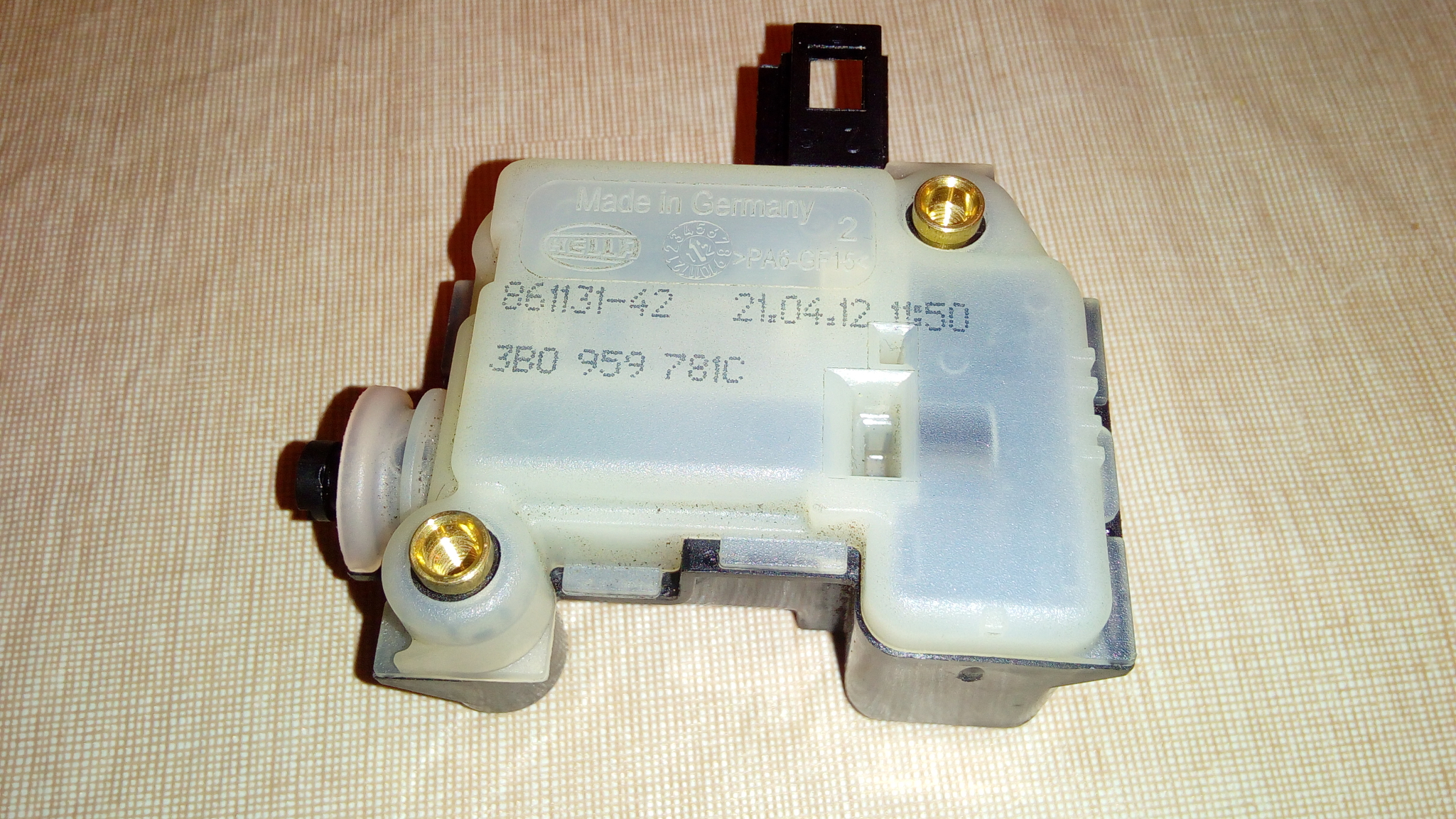 Здравейте отново колеги! Днес разреших проблема с машинката. Бях си поръчал нова машинка от магазина китайска. Пристигна днес и какво се оказа. Тази е пълна противоположност на другата. Буталцето е постоянно изпънато. Като се подаде ток от централното за заключване, то се прибира и след 2 секунди излиза и ми отключва багажника, при заключени врати на колата. Върнах машинката. Ходих до моргата и свалихме от един седан машинка. Пробвах я и най-после читава. Подаваме ток, буталото излиза и си остава така. Обръщаме плюс и минус и то се прибира и остава така. В крайна сметка се оказа че на пазара съществуват 3 вида машинки. Проблемът е че в магазините за авточасти не знаят това и поръчват някаква, но дали ще стане не се знае. Кода на машинката която купих от моргата за 20 лева оригинална на Hella e 3BO 959 781 . Кода на машинката която беше монтирана в Италия и булацето има пружинка която го държи постоянно прибрано е - 3BO 959 781C. Китайската няма код, но сигурно разликата е накрая в буквата. Ето сега на двете снимки как изглежда при заключено и отключено положение...