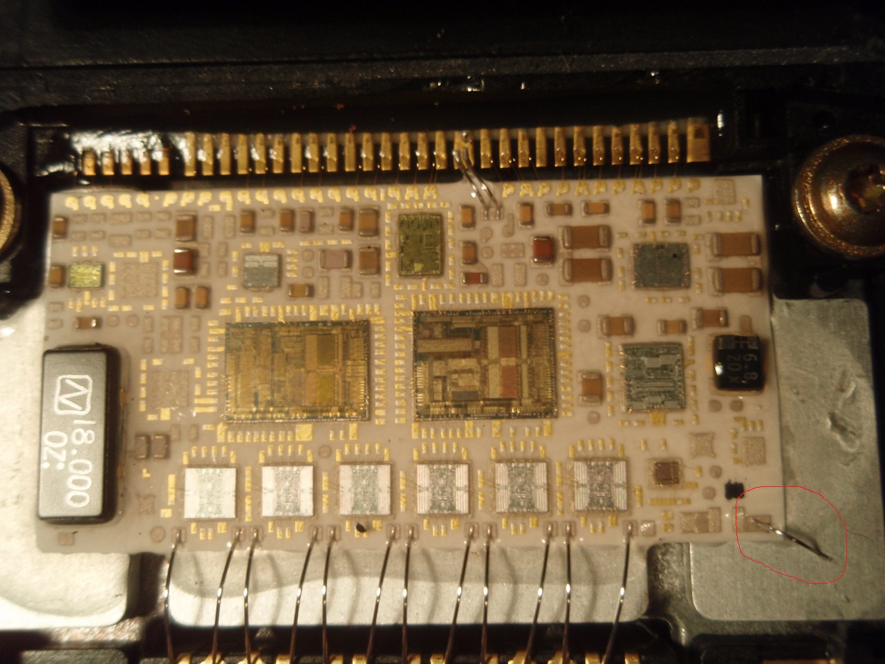 Другия въпрос е: Основата на хибридната схема е също на маса и е от солиден алуминий, дори си има една жичка от платката към нея някъде в другия край(ограденото с червено). Накой пробвал ли е там да замаси? Като гледам не е невъзможно да се направи например 2мм резба и болтче, или дори с малка видия в алуминия,и един проводник да се закара на въпросното краче? Мястото е удобно за работа.