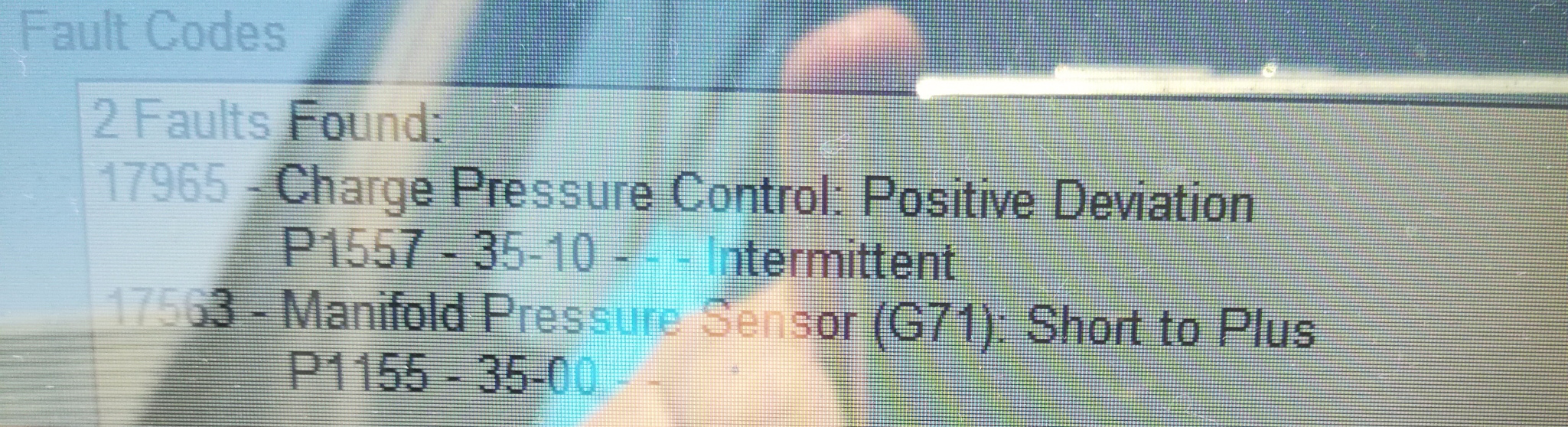 Втората грешка: мап-а - късо към плюс. Мап-а може да е дефектен, може кабелите към него да са пречупени или оголели и окъсяват. Той определя колко да е Duty Cycle на N75, т.е. колко да е отворена геометрията на турбото. Ако мап-а "умира" колата ще стане SDI.